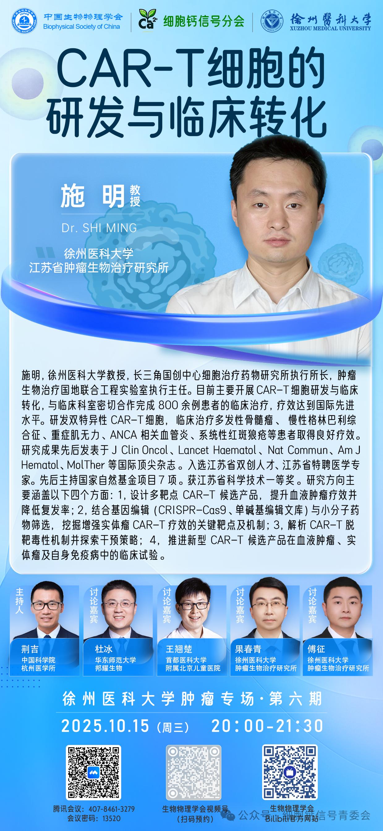 本次线上研讨会是中国生物物理学会-细胞钙信号分会与徐州医科大学-江苏省肿瘤生物治疗研究所系列讲座的第六讲。我们非常荣幸地请到了徐州医科大学施明教授,为大家介绍他在CAR-T细胞研发与临床应用领域的实践历程。