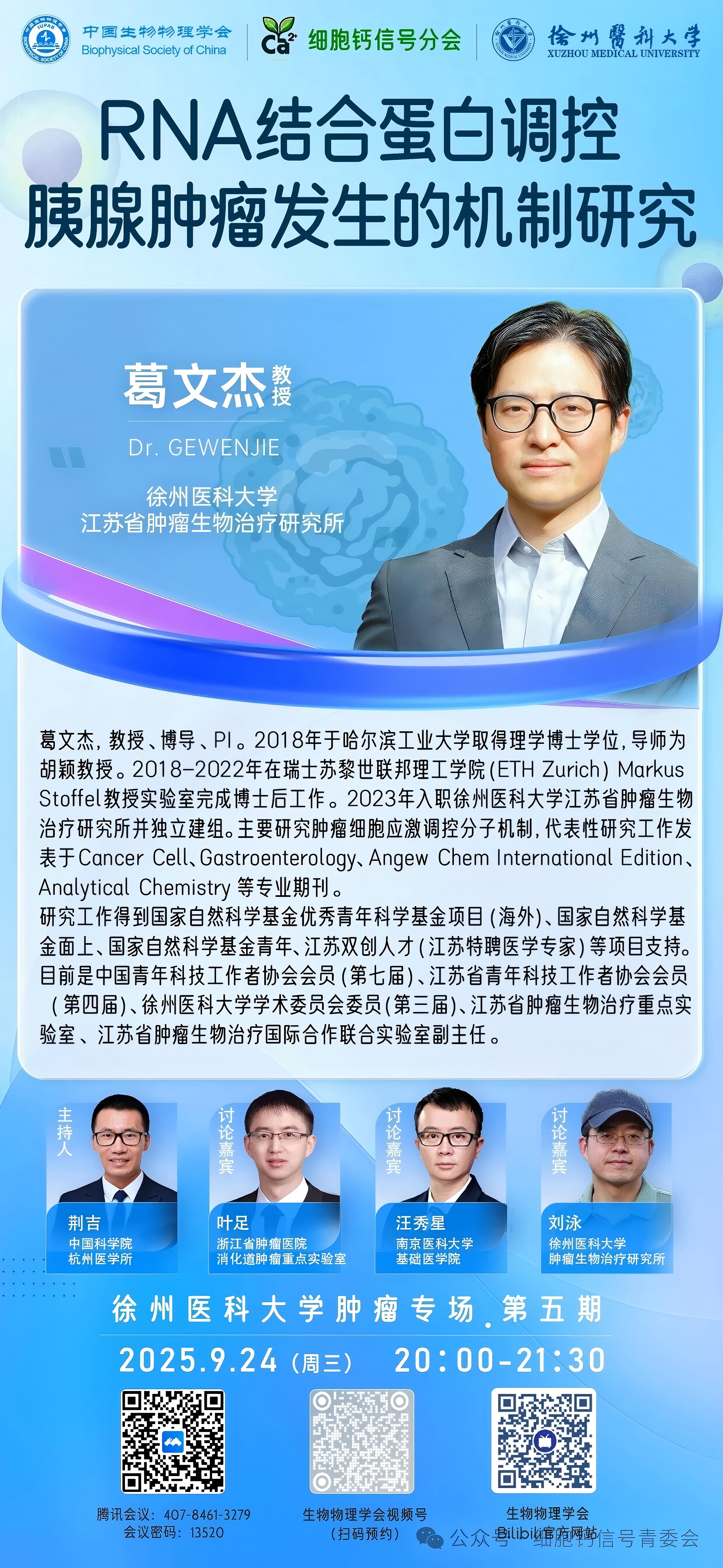 本次线上研讨会是中国生物物理学会-细胞钙信号分会与徐州医科大学-江苏省肿瘤生物治疗研究所系列讲座的第四讲。我们非常荣幸地请到了徐州医科大学葛文杰教授,为大家介绍他在RNA结合蛋白与胰腺肿瘤研究中的发现。