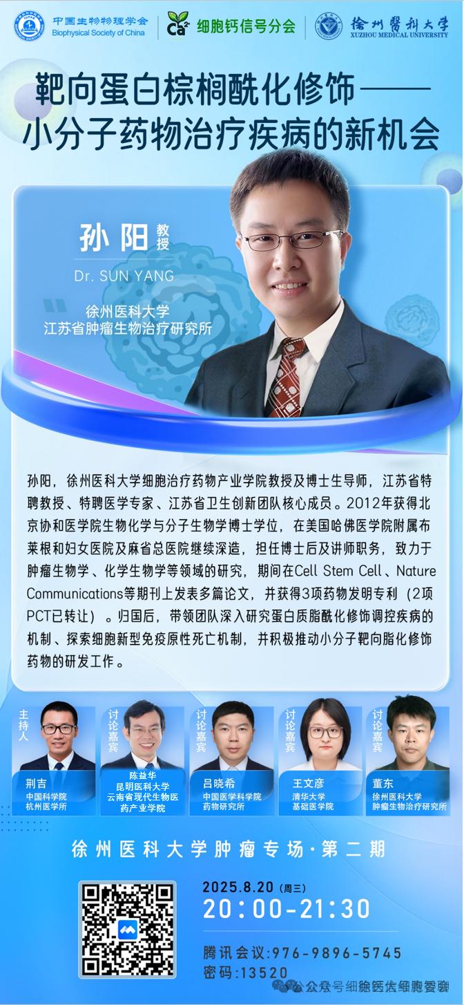 从2025年8月13日(周三)开始,每周三晚20点,中国生物物理学会-细胞钙信号分会联合徐州医科大学江苏省肿瘤生物治疗研究所,共同举办徐州医科大学肿瘤与细胞治疗系列讲座。邀请了六位活跃于肿瘤治疗以及抗肿瘤研究的领域的知名专家,以及多位重量级讨论嘉宾。为我们带来细胞治疗系列课程,旨在促进各位对该领域最新研究进展的理解,促进研产医一体化进程。