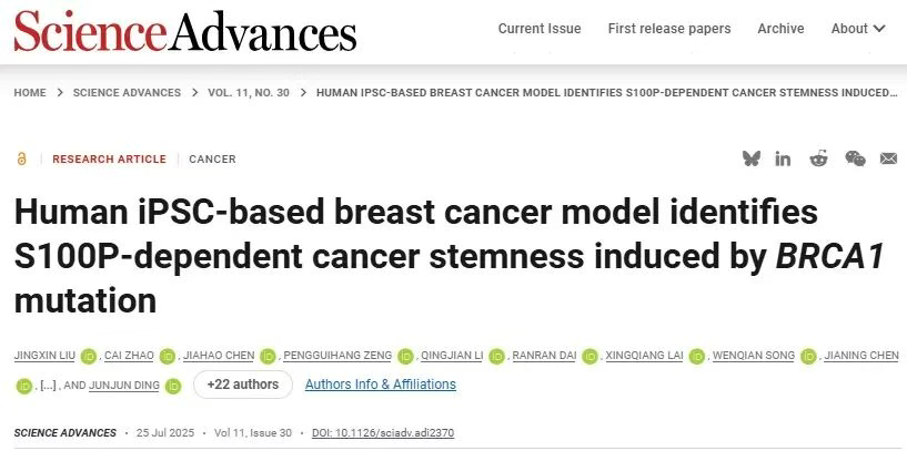 中山大学丁俊军、徐州医科大学细胞治疗药物产业学院白津、中山大学附属第七医院黄东锋、广州国家实验室索生宝共同通讯在Science Advances在线发表题为“Human iPSC-based breast cancer model identifies S100P-dependent cancer stemness induced byBRCA1mutation”的研究论文。该研究开发了一种从人诱导多能干细胞(iPSCs)中生成功能性乳腺样细胞(MCs)的方法。