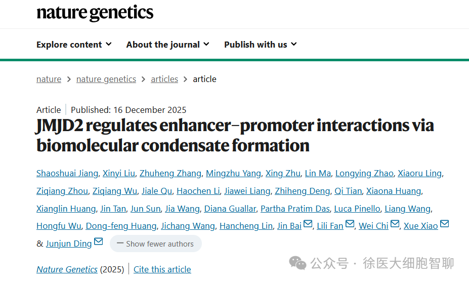 2025年12月16日,中山大学中山医学院的丁俊军教授和徐州医科大学白津教授等团队在国际权威期刊《Nature Genetics》(影响因子:29.0)发表题为“JMJD2 regulates enhancer–promoter interactions via biomolecular condensate formation”的研究论文,为该领域的研究提供了重要突破。