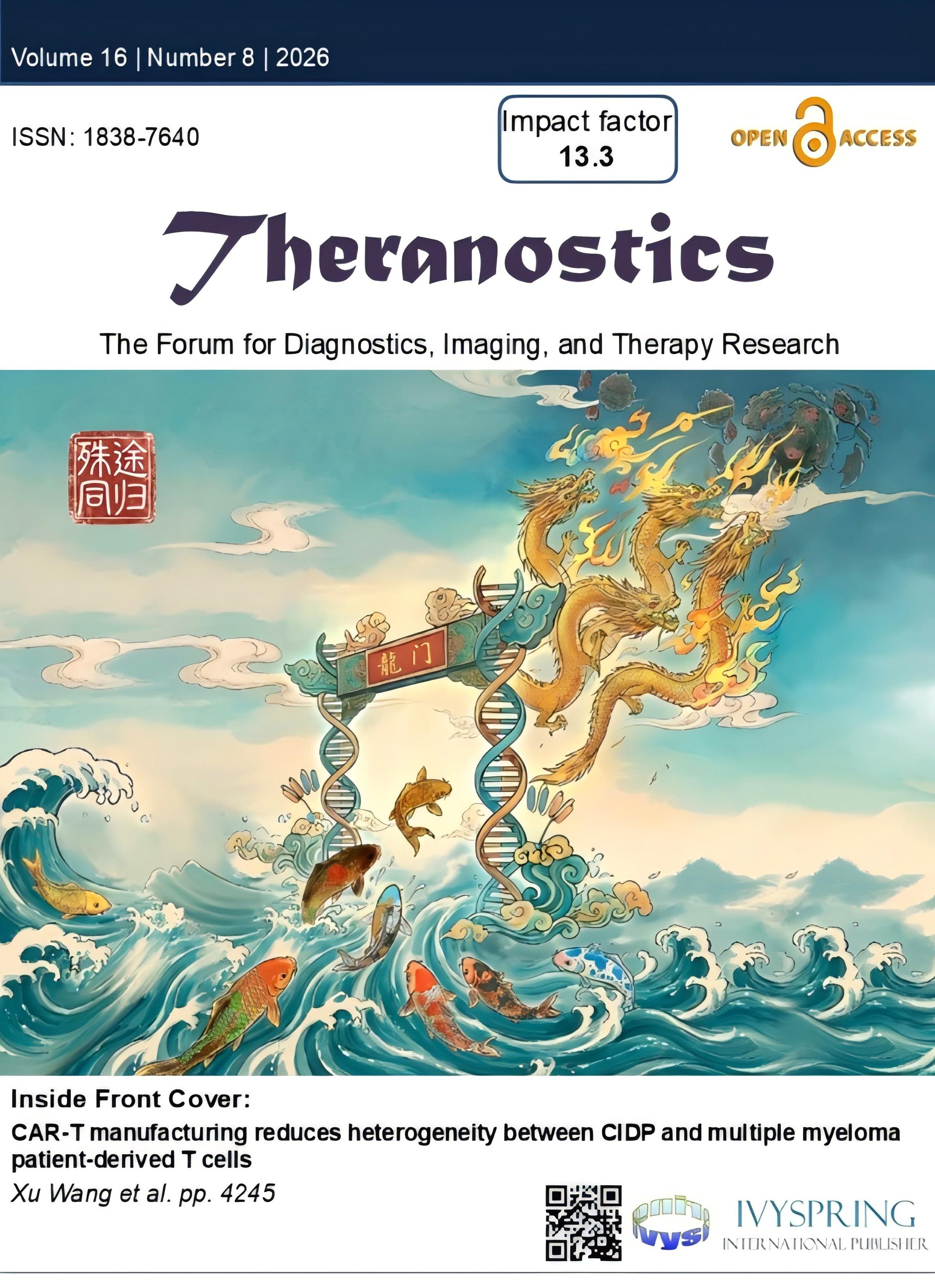 近日,本团队在Theranostics杂志(中科院一区Top期刊,IF=13.3)发表的最新研究成果“CAR-T manufacturing reduces heterogeneity between CIDP and multiple myeloma patient-derived T cells”成功入选当期封面文章。施明教授、刘丹副教授为本文共同通讯作者,青年教师王旭和硕士研究生王璞为共同第一作者,硕士研究生周奇参与该工作及封面设计。